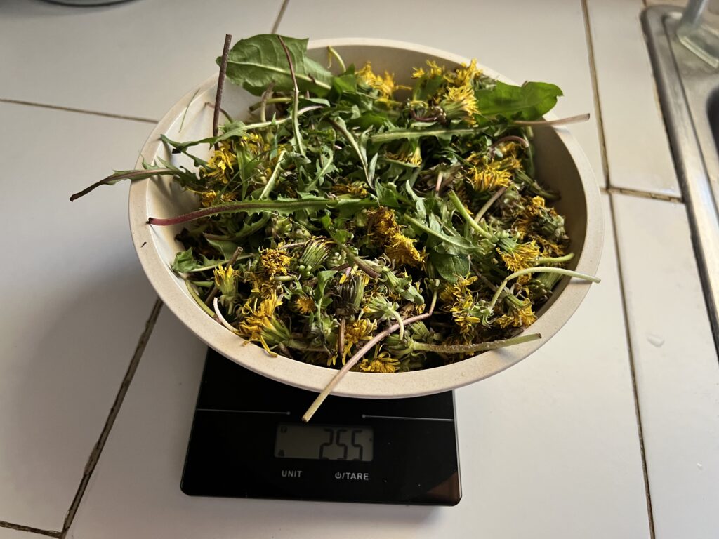 Pick dandelions and leaves if using. Pick at least equal amount in weight of dandelions to fabric.