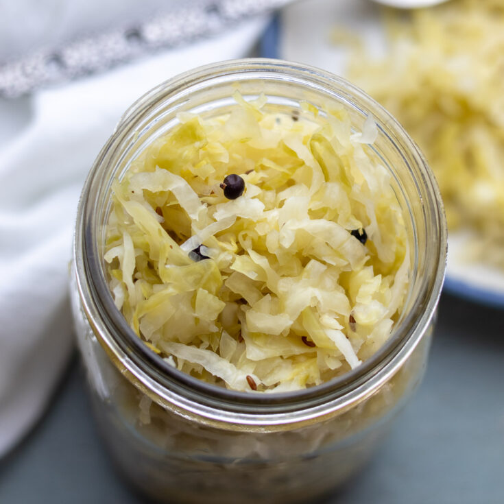 This German or Bavarian-style sauerkraut combines a classic European kraut combo — juniper and caraway — for a woodsy, aromatic flavor. The name of my site may give it away, but juniper is one of my favorite culinary ingredients! If you love juniper too, you may enjoy my easy DIY compound gin tutorial.